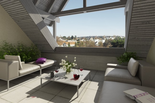 Geniessen Sie den Ausblick aus der gemütlichen Loggia der Dachwohnung.